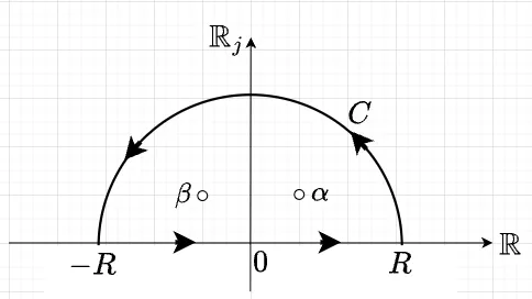 \(C\)内の極は、\(\alpha, \; \beta\)なので、\(f(z) = \frac{1}{1 + z^4}\)にたいする線積分は、$$\int_C = \int_C \frac{1}{1 + z^4} = 2 \pi j \cdot \left\{\text{Res}\left(\frac{1}{1 + z^4},\; \alpha\right) + \text{Res}\left(\frac{1}{1 + z^4},\; \beta \right)\right\}$$となる。 ここで、「留数の計算公式2」を使うと、$$\text{Res}\left(\frac{1}{1 + z^4},\; \alpha \right) = \frac{1}{4 \alpha^3} = \frac{e^{-3\pi j/4}}{4} = \frac{-1-j}{4 \sqrt{2}} \\ \text{Res}\left(\frac{1}{1 + z^4},\; \beta \right) = \frac{1}{4 \beta^3} = \frac{e^{-9\pi j/4}}{4} = \frac{1-j}{4 \sqrt{2}}$$となるので、$$\int_C = 2 \pi j \left(\frac{-1-j}{4 \sqrt{2}} + \frac{1-j}{4 \sqrt{2}} \right) = \frac{\pi}{\sqrt{2}}$$である。