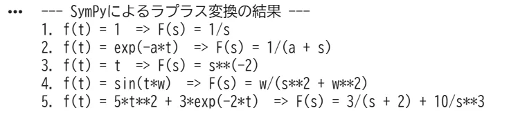 Pythonでラプラス変換(\(\mathcal{L}\) 変換)を解析的に行うには、SymPyライブラリの記号計算機能を使用する。これにより、解析的な数式操作を数式として処理できる。以下にスクリプトの例を示す。